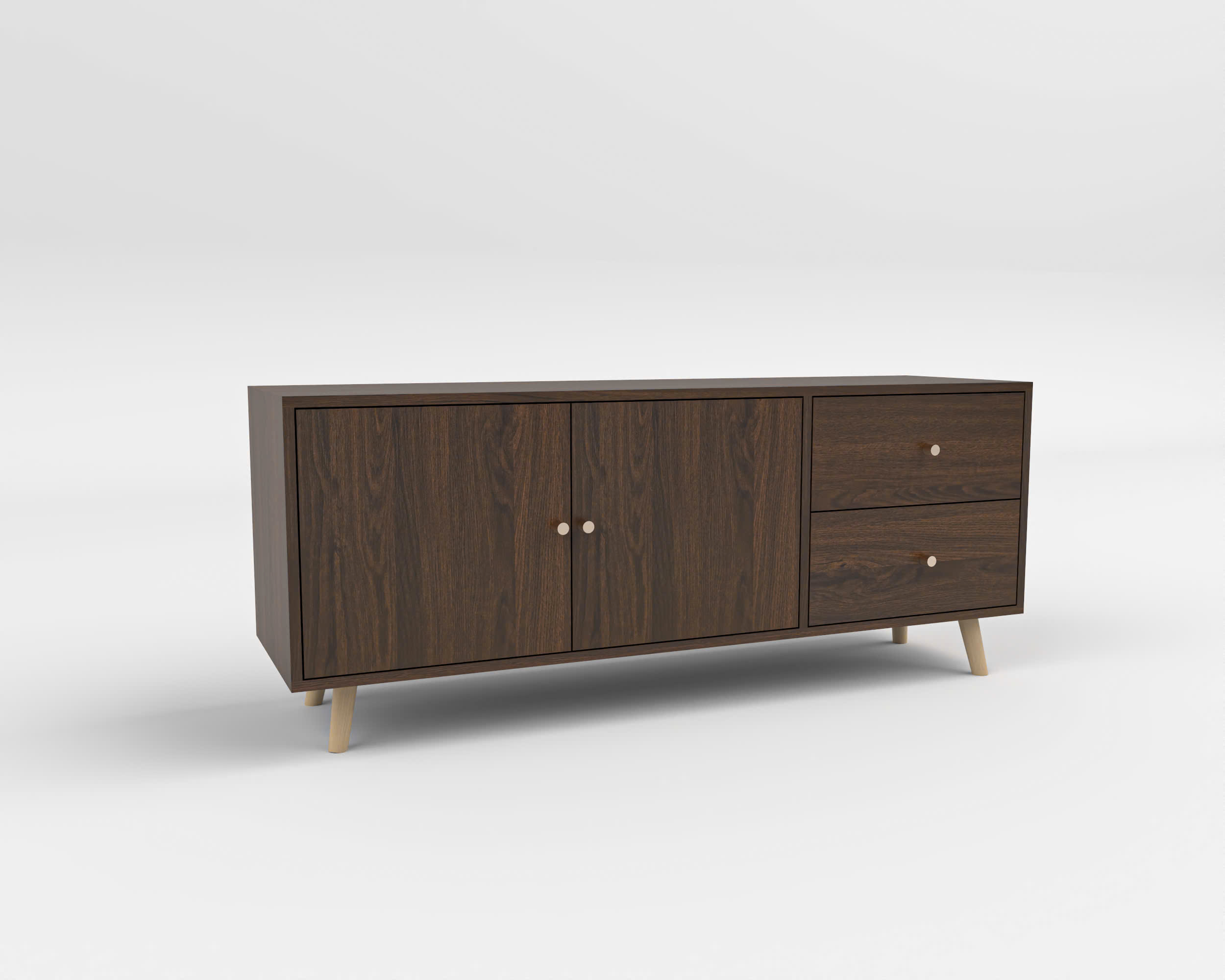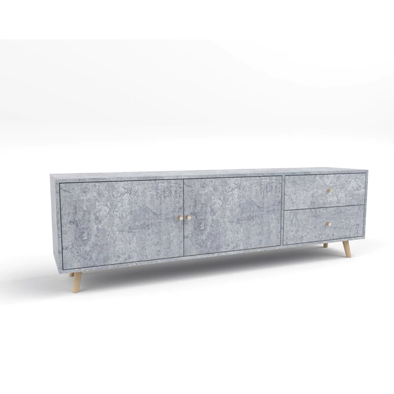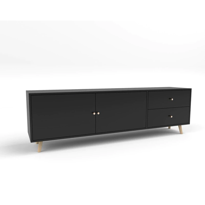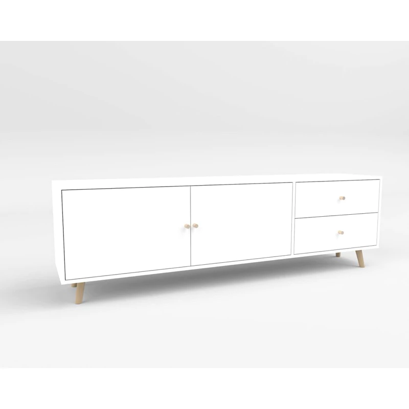 Sản phẩm sở hữu thiết kế chân gỗ chéo vát nhẹ, tạo cảm giác thanh thoát nhưng vẫn đảm bảo sự chắc chắn. Với bố cục 2 cánh tủ lớn kết hợp 2 ngăn kéo, chiếc kệ giúp bạn dễ dàng lưu trữ các thiết bị điện tử, tài liệu hoặc đồ dùng cá nhân một cách ngăn nắp và gọn gàng.
